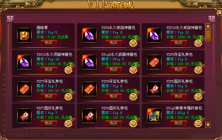 做到VIP等级标准的新服游戏玩家,可以从VIP商城系统内选购永久性钻戒软件(1000元等级)、永久性颈链软件(1000元等级)、永久性武器装备软件 (5000元等级)。